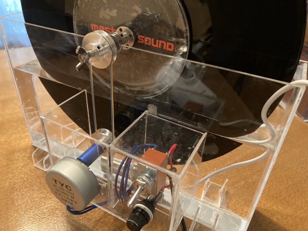 レコード回転軸にはフランジ付きのベアリングをつけて正面と背面のアクリル板につけた半円の切り欠きにはめ込んでいます。減速機付きのシンクロナスモーターで約80秒で1回転します。