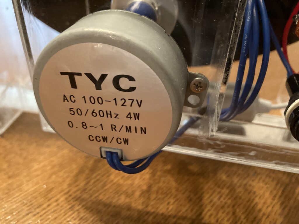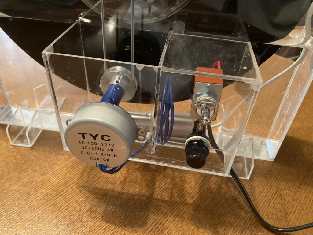 ・モーターは超安価で低回転減速機構付きのシンクロナスモーターを採用し、ベルトドライブで回転軸を回す。