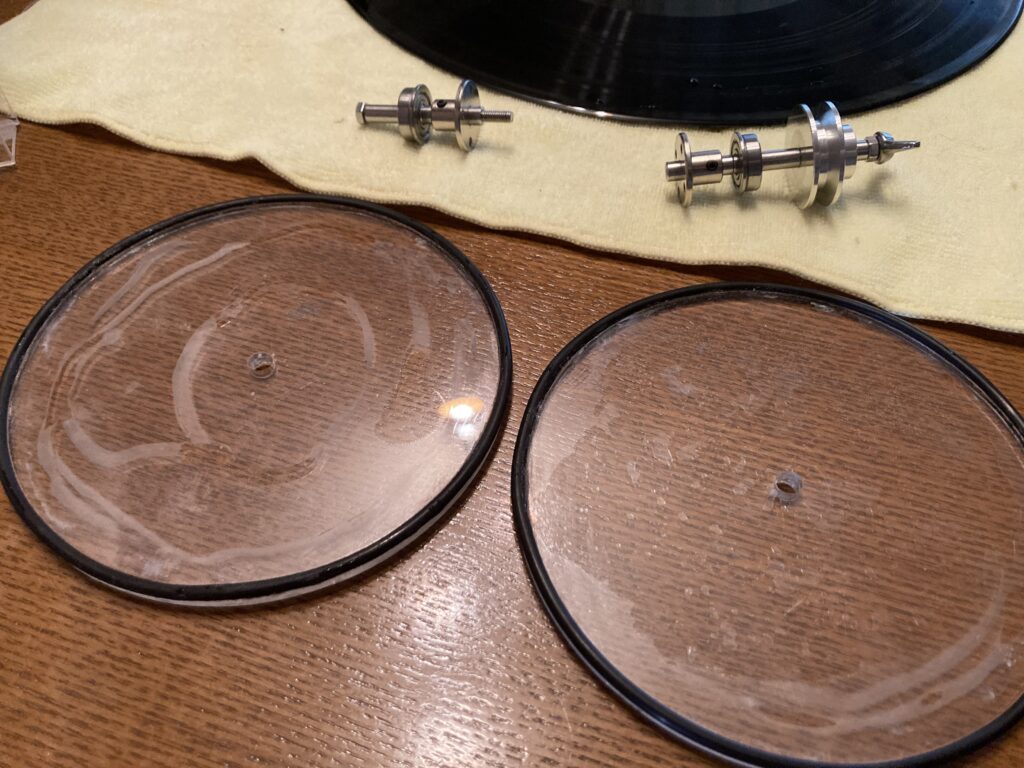 シール自体はLP中央の無音部分にOリングをあてることで実現します。実際に選んだOリングのサイズは内径Φ125で太さ3mmのものです。このOリングを引っ掛けるためのアクリル円盤は外径Φ125mmで厚み2mmです。また1枚目のアクリル円盤の下にΦ130のアクリル円盤をもう1枚セットします。