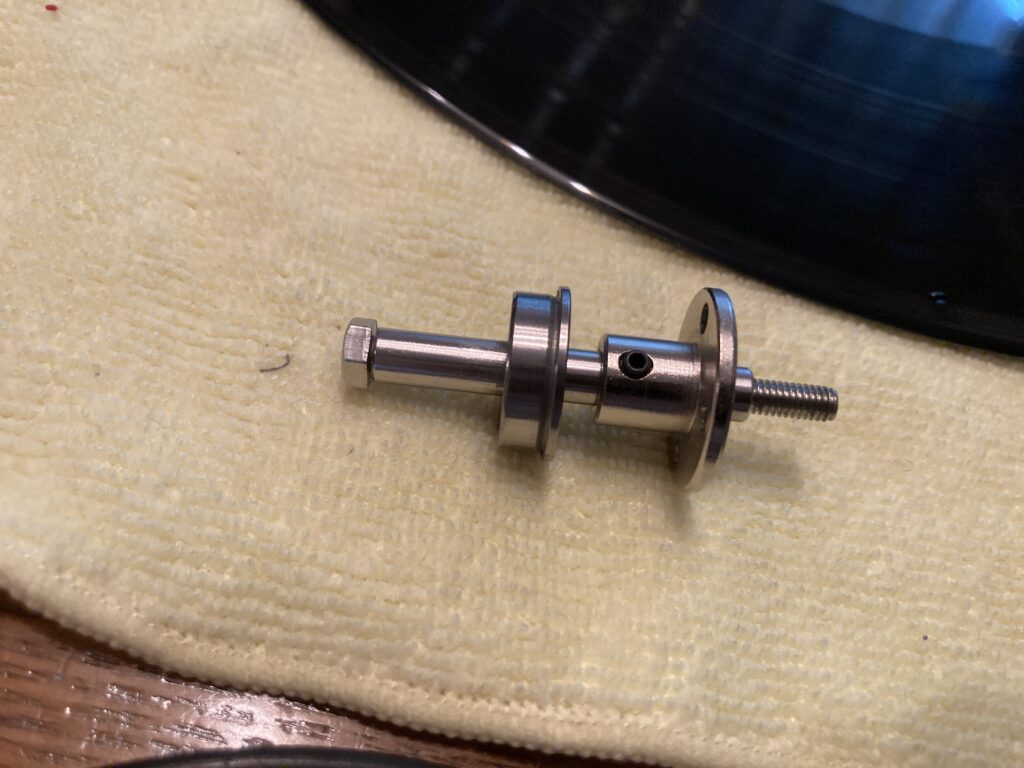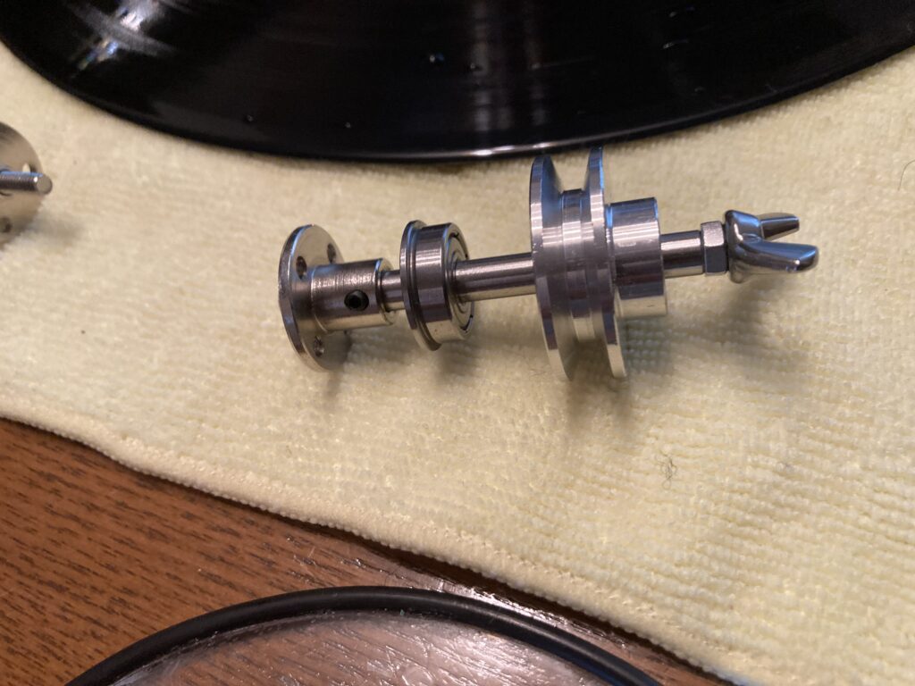 ・回転軸の構成は蝶ねじ(長ねじ)、円形断面高ナット、フランジ付きベアリング、回転伝達用プーリー、レーベル押さえアクリル円盤1,2、シール用Oリング、レコード押さえ金具(アンカー)からなる。